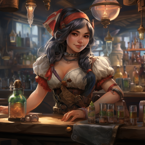 A female aarakockra from dungeons and dragons. An aarakockra is a bird human hybrid with a birds face, wings, hands, and feet, but with a human-shaped body. This aarakockra is happy and holding twizzler candies in her hand. Twizzler candies are long red candies with a spiral shape. She is flying above a small medieval-style town wearing armor.