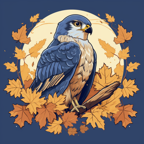 fall falcon anime aesthetic school mascot in medium blue and yellow with autumn leaves