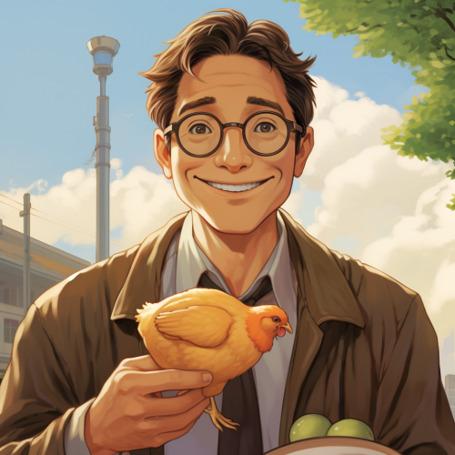 In a breakfast scene, there is a father in his thirties wearing round glasses. He has a bright and joyful smile on his face as he holds a chicken egg in one hand. The scene is depicted in a Japanese anime-style illustration.