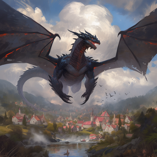 Grimdark mystic ominous angry wyvern flying above a medieval lake village, anime style, extreme close-up view, high fantasy, digital art, masterpiece painting, ultra detailed, ultra high definition, 8K resolution, heavy shading, superior quality, cover illustration, complex design, luminous highlights, rich vibrant colours, hyperrealistic, meticulously hyper detailed, high contrast, artstation --niji 5