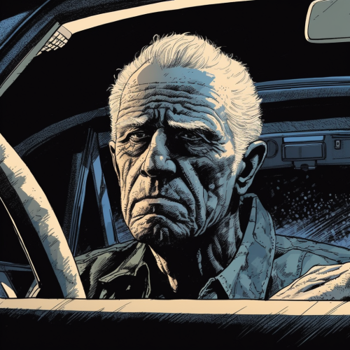 Comics with a touch of Frank Miller's style. Hank stands defiantly before the arrogant new race cars, determination in his grill-mouthed expression. Dramatic lighting highlights the tension in the air, his grit visible despite his age. --v 5.0 --stylize 1000