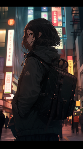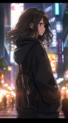 japanese girl with back turned to the camera, wearing a black oversized hoodie in downtown tokyo, anime style of makoto shinkai --niji 5 --ar 9:16
