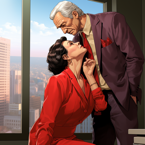 In the style of Grand theft auto promotional art. A japanese matriarch with grey hair in a red suit threatens a man angrilyin her luxury penthouse office. Cell shaded. Retro.
