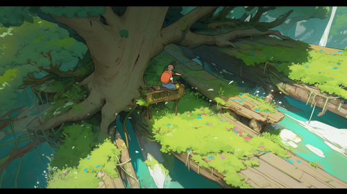 jungl, giant tree log horizontal crossing tow banks, void underneath, and river below, fully details , plants everywhere, epic lighitng, epic compostion, colorful, fun , anime screencap, ultimate details, --ar 16:9 --s 90 --style expressive --niji 5