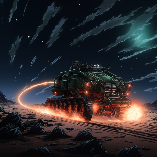 a buggy pulling a trailer on the lunar surface; it is firing a laser; lasers are being fired at it; in the style of black lagoon anime --v 5.2