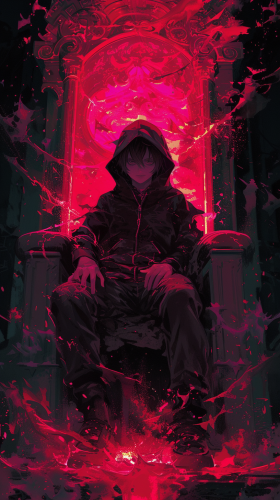 In a digital painting inspired by Takashi Takeuchi, a hooded young anime boy is sitting on a throne engulfed by chaotic dark energies, surrounded by swirling shadows and malevolent auras. The color temperature is a fusion of ominous blacks and fiery reds, with the boy's expression hidden beneath the hood, shrouded in enigmatic intensity, all illuminated by the eerie, otherworldly glow of the dark energies. --ar 9:16 --v 6.0
