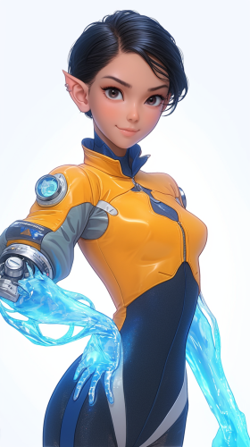 Create an image of an Asian Chinese woman. With blue ice for skin. Frozen sci-fi hair. 1984s style multi-racial Asian hero with ice powers. round pointy ears and slanted eyes. Hair frozen upward. Happy, smiling. in a 16:9 aspect ratio, art style 3D Pixar animated character, colorful. Wearing a yellow bomber jacket with blue and grey sleeves over an 80s futuristic spandex uniform. 80s American glam rock inspired. Sci-fi character with Large shoulder pads. Ready to fight. minimal detail. --ar 9:16 --niji 6