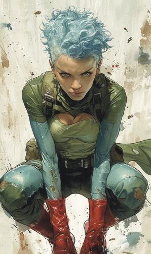 illustrative portrait for a comicbook by Olivier Coipel, Superheroine Alisee, indian alien looking women with short blue hair and white eyes, has bright green bodysuits in arabic fashion style with bright red boots, in full body in the style of Geoff Johns and Satoshi Kon, ink paper and faded colors, archeological illustration --chaos 3 --ar 3:5 --style raw --stylize 250 --v 6.0