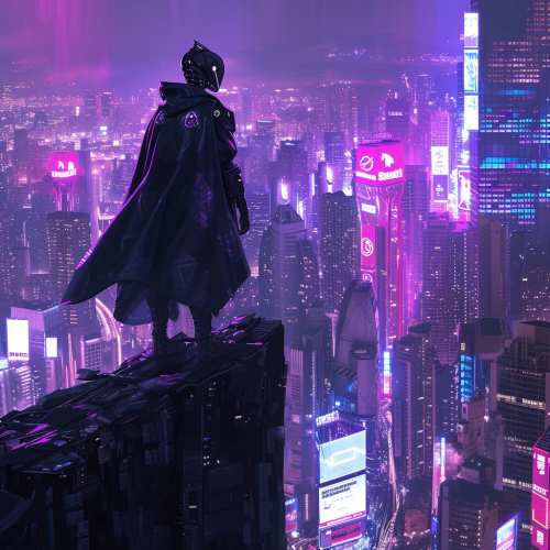 In a futuristic, neon-lit cityscape, a masked man stands atop a towering skyscraper, his silhouette a striking figure against the sprawling urban backdrop, his attire, a blend of revolutionary elegance and modern warfare, reminiscent of the style of 'Code Geass', the mask, sleek and enigmatic, covering his face entirely, serves as a symbol of his commitment to black power and justice, its design intricate, with sharp angles and a glossy finish that reflects the city's lights, his cloak, billowing in the night wind, is adorned with symbols and motifs that represent his cause, a fusion of traditional African patterns and futuristic elements, the city below him, alive with the pulse of neon signs and holographic displays, contrasts with his dark, powerful presence, his stance, one of determination and defiance, overlooks the metropolis, a silent guardian advocating for change and empowerment, his figure, surrounded by a subtle aura of rebellion and mystery, becomes an icon of resistance and strength in a world of high-tech oppression and cultural struggles, the scene, a dramatic tableau of heroism, identity, and the fight for justice, captured with photorealism, hyperrealism, as if taken with a Sony a6300, in 32k UHD, and cinematic color grading, --v 6.0