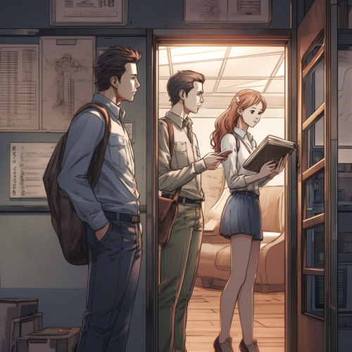 There is a man in the foreground, he is slightly agitated and enthusiastically selects a book. Through the open door in the background you can see a room that looks like an airplane cabin. There is a woman in the image of Venus standing in the room. She looks at the man with a loving gaze. Anime style. --v 5.0 --s 250