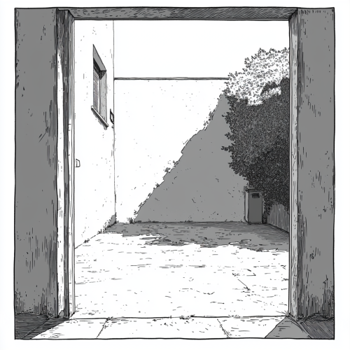 black and white minimal illustration of a doorway on the street that opens up to an empty courtyard. very minimal, colouring book style. --s 250 --q 2