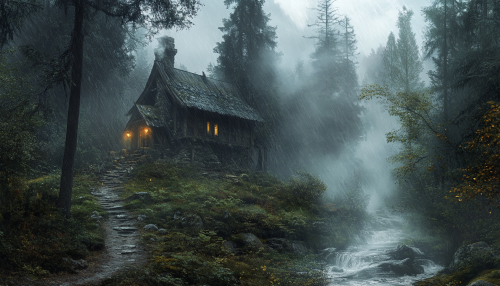 Deep forest outpost, dungeons and dragons style Dark Fantasy, foggy and rainy forest. An outpost sits above a trail, rain falls and the roof sheds the water down into a creek. The outpost is small but looked after, cozy and comftable with smoke coming from word burning stove --ar 7:4