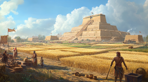 The rise of Uruk, circa 3000 BC, showcasing the rapid development of agricultural technology. Early farmers are busy constructing intricate irrigation systems using wooden tools to channel water from the Tigris and Euphrates rivers into lush, fertile fields. In the foreground, farmers are seen sowing seeds and harvesting golden wheat and green barley under a bright blue sky, symbolizing abundant food production. In the background, the emergence of artisans and merchants is evident; skilled craftsmen create pottery and tools, while a small vendor negotiates with a customer, highlighting economic prosperity. A majestic castle or ruler's residence towers in the background, representing the concentration of power with nobles in fine clothing discussing governance. On the left, a temple is visible with priests performing ancient rituals, surrounded by devoted followers, showcasing the cultural and religious life. The scene is bathed in warm sunlight, casting soft shadows, and depicting a vibrant, thriving society where agriculture, commerce, and governance intertwine --ar 16:9
