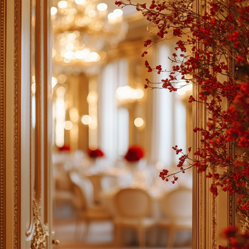 hald open gold door, out of focus beautiful ornate gold room with large mirrors and chandelier in background warm light, red flowers, festive --style raw --v 6.1 --s 250