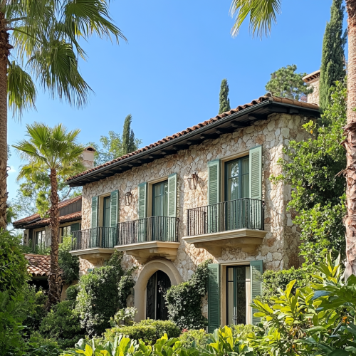 A photograph of a Mediterranean-style luxury townhouse surrounded by lush tropical greenery, including tall palm trees and vibrant bushes. The building has a stone facade with large shuttered windows and a soft beige tone, complemented by pastel green accents on the shutters and balcony railings. The clear blue sky provides a stunning backdrop, highlighting the bright and sunny day. The image was likely captured with an iPhone, offering a crisp and detailed view of this serene residential setting. --s 750 --style raw