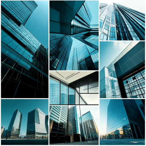 A one-page website for a commercial real estate investment company. Horizontal images of modern, expensive, luxurious buildings. The style is minimalistic, modern, with an emphasis on prestige and reliability. The color scheme is shades of green and blue, emphasizing success and stability. Visual style in accordance with current Dribbble trends, with elements of digital art and UI/UX design: elements 3d, photography, octane, render, 8k, white, photorealistic, cinematic, hyperrealism