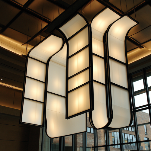 Create a grand, geometric ceiling installation with bold, structured forms. The design should feature large, vertical panels with smooth, curved edges, framed by dark metal for a modern, industrial feel. Each panel should emit soft, diffused lighting from behind, creating a warm glow. The piece should be modular, allowing for easy assembly and manufacturing with materials like lightweight metal and fabric or acrylic panels. Focus on a clean, symmetrical aesthetic, with an emphasis on simplicity and ease of production while maintaining a striking, architectural presence.