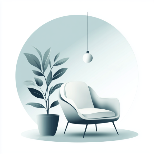 Create a luxury logo illustration of a modern apartment interior with a circular background. The design should feature an abstract style using smooth, solid shapes without outlines. Incorporate a sophisticated, simple chair, a houseplant, and a hanging light, using overlapping layers for added depth. The color scheme should consist of pale blue tones, with elements that may extend beyond the circular boundary to create a dynamic look. The overall feel should be refined and elegant, suitable for a high-end brand.