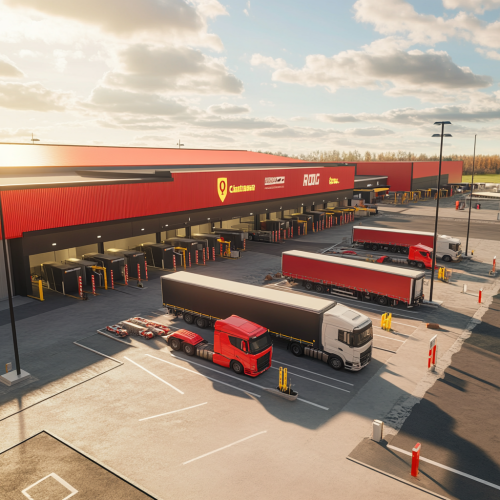 An automatic filling station for trucks in red, white and black. The sun is shining. Trucks are parked on 5 lanes and filling up. In the background is a large warehouse. Liberthon Transport is written on the trucks. The sun is shining.