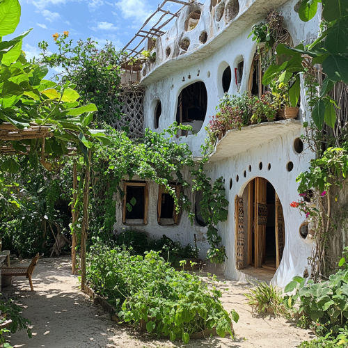 Front shot of 4 rooms sharing a wall with a small verandas in front all private from each other. Ferrocement art roof with hydroponics on top to make it green. Zanzibar