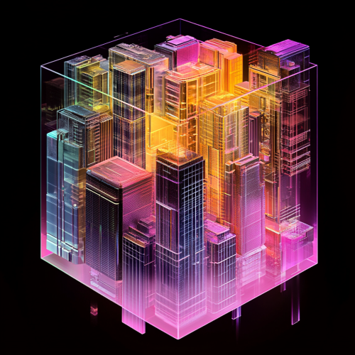 Create an ultra-realistic futuristic cluster of buildings with symmetrical structures, all enclosed within a transparent cube that features a gradient from yellow to purple. The buildings should have sleek, modern designs and intricate details, emphasizing the harmony of shapes and symmetry, background full black --v 6.1