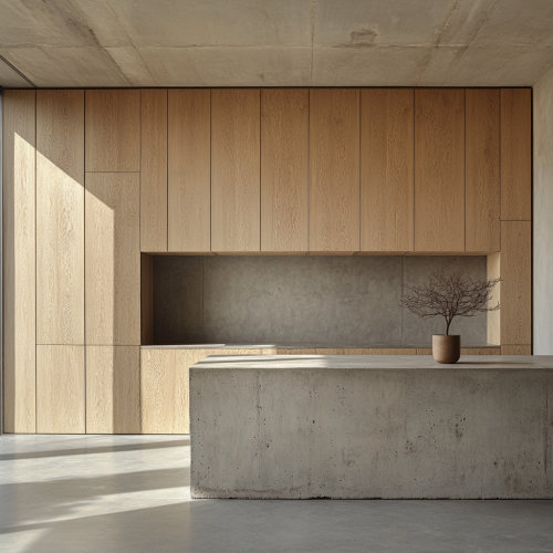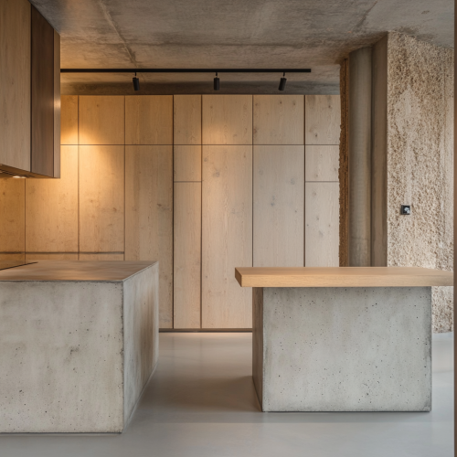 foyer, reception counter made of concrete with table top in light maple wood in front of high wall cabinets in concrete look. The high wall cabinets adjoin a kitchen matching in design on the left side. the cupboards of the kitchen unit have the same concrete look like the wall cabinets behind the counter. overall industrial style.
