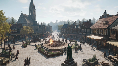 A town square in a medieval era town bustling with activity. On the left edge is a tall Cathedral. In the background is the town hall. On the right is the constabulary and the tavern. The town hall sits on the northeast corner of the square, at the intersection of two busy streets. In the middle of the town square is a raised platform flanked by three statues. Each corner of the raised platform is framed by corner-shaped flower beds. In the middle of the raised platform a wooden pyre is being constructed, but is not yet lit. Thick and unbroken overcast skies above. Fantasy RPG setting, wide angle, --ar 16:9 --v 6.1