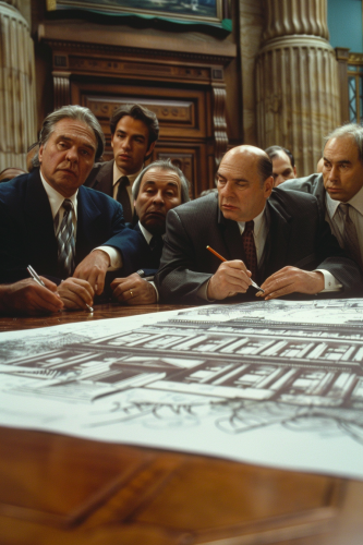 35mm a group of serious middle-aged people in formal suits sits at a table and draws a bank building on a large sheet of paper with felt-tip pens --ar 2:3 --v 6.0