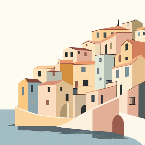 Create a creative, minimalist illustration of the Sardinian village of Bosa. Focus on the iconic colorful houses stacked along the riverbank, simplifying the forms to basic geometric shapes and clean lines. Use a limited color palette with soft, muted tones--light pinks, blues, yellows, and earthy shades--evoking the charm of the village while maintaining a minimalist aesthetic. Highlight key architectural features like the narrow streets and rooftops, but keep details minimal, with flat, solid colors and minimal texture. The composition should feel airy and modern, with an emphasis on simplicity and elegance, capturing the essence of Bosa in a contemporary, artistic style.