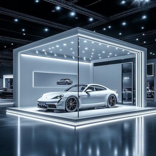 A small 3D exhibition booth for displaying cars, designed with minimalistic style and using Fomex panels for walls and structure. The booth features clean, sharp lines with a white and light grey color palette. Cars are displayed on static platforms with soft lighting to highlight the vehicle’s features. The Fomex panels give the booth a smooth and modern look, and the backdrop includes a basic branded banner. The booth has a professional but simple appearance, with functional design elements and cost-effective materials --v 6.1 --s 250
