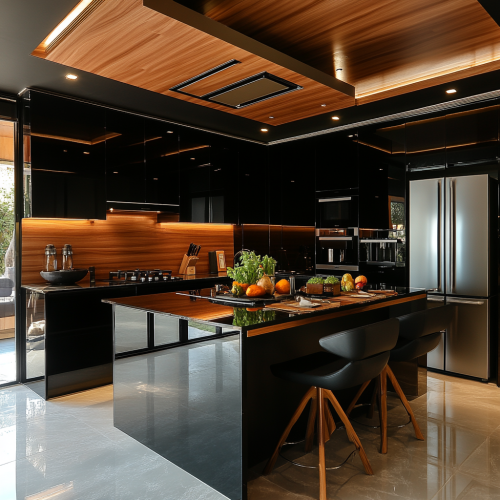 modern open kitchen interior design, u shape layout, right side is 3 meter, lift side is 1.5 meter, front side is 3 meter, island in the center, fridge at right side, sink in the right corner, cooker in front, black color with wood touch --v 6.1