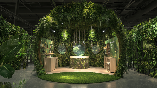 open island pop up booth could be approached from any angles, with concept of rainforest arboretum, made from 2 arch walls facing each other and at top center round plafond ceiling as accent with hanging lush greenery plants, inside there will be wall fountain and nature sink and racks, for people photobooth green grass shaped like bottle silhouette, all full with lush tropical greenery, only natural earth stone pattern, isolated white 8K, --ar 16:9