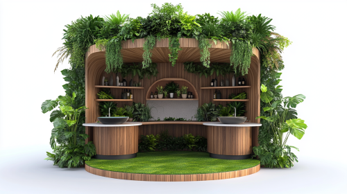 open island pop up booth could be approached from any angles, with concept of rainforest arboretum, made from 2 arch walls facing each other and at top center round plafond ceiling as accent with hanging lush greenery plants, inside there will be wall fountain and nature sink and racks, for people photobooth green grass shaped like bottle silhouette, all full with lush tropical greenery, only natural earth stone and wood pattern, isolated white 8K, --ar 16:9