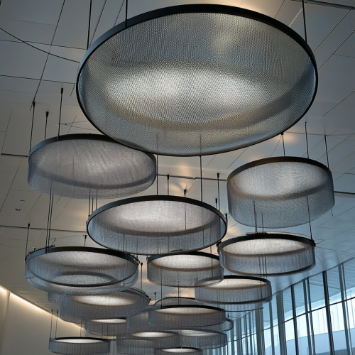 Design a large, modern ceiling installation featuring circular metal frames in varying sizes, suspended at different heights to create a layered effect. The structure should incorporate thin, semi-transparent mesh or wire panels to give an airy and lightweight appearance. Focus on a minimalist design using simple geometric shapes, ensuring that it can be easily manufactured with basic materials like metal tubing and mesh. The overall look should be elegant, with clean lines and a striking, sculptural quality.