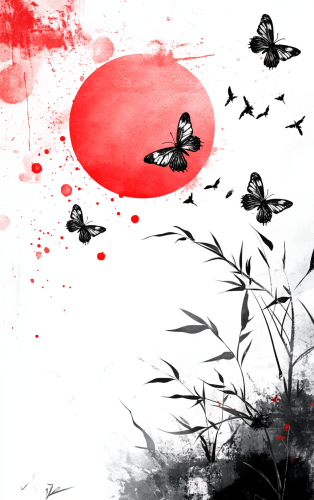 White blank frame with a red sun and butterflies, digital art with brush strokes and watercolor, colorful and beautiful, with simple and warm colors, a nature background, and an empty white space in the middle of the page for writing text or graphics. --ar 5:8