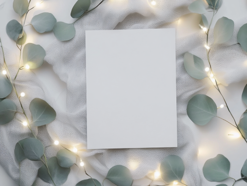 Blank postcard mockup A5 format, white paper with eucalyptus branches and lights around, top view, high resolution, no text or graphics on page, neutral background --ar 4:3 --v 6.1