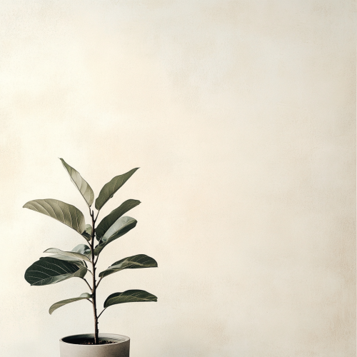 Soft off-white wall with a faint beige gradient blending toward the edges, natural lighting creating a subtle and airy look, delicate potted plant at the far edge with broad, soft green leaves, minimalist and stylish background.