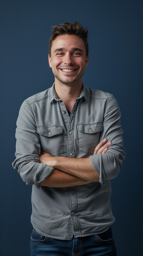from the waist up of a man in a grey shirt and some jeans smiling holding folding his arms infront of a navy blue gradient background --ar 9:16 --v 6.0