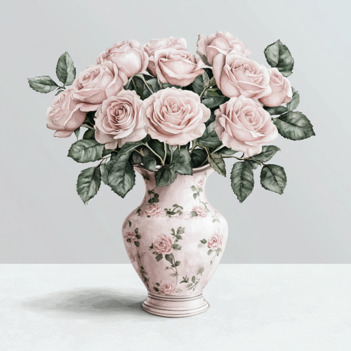 highly detailed watercolor clipart of a beautiful porcelain vase and a huge bouquet of roses in it in a light pastel pink color, luxury aesthetic, beautiful illustration with realistic details, high resolution, gray background