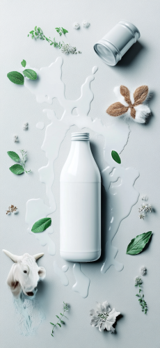 Generate a photorealistic version of Photorealistic minimalistic background with a light gray background, small elements such as a milk bottle, a cow, a milk can, a dairy farm, and a milk splash at the edges, in a flat lay arrangement. Use contrasting colors like white, light blue, and light green for the elements to ensure they stand out against the light gray background. Make sure the elements are small and do not overshadow the slide content. . --ar 443:960