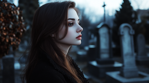 panoramic view of a cementary beautiful brunette close to a grave photorealistic, high resolution, rectangular, vibrant colors, perfect for a PowerPoint background, cinematic lighting, 16:9 aspect ratio --ar 16:9
