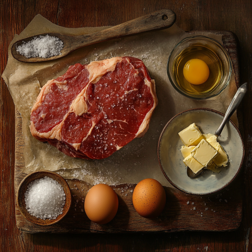 Create a delicious, hyper-realistic, high-resolution Carnivore background for a Facebook group in 16:9 format, showcasing meat, eggs, butter, salt, and water.