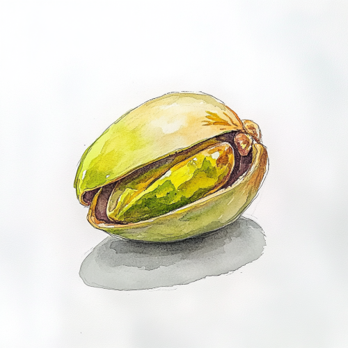 Pistachio drawn with a pen. Rough. I don't feel like I'm that good at it. The atmosphere is deliberately relaxed. Colored with watercolors. Background white.