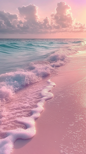A peaceful beach scene with light waves gently washing over pastel sand in shades of pale pink and beige, with a clear, soft lavender sky overhead, giving the scene a dreamy, airy quality. --ar 9:16 --style raw --s 250