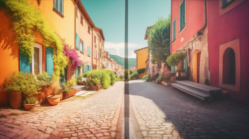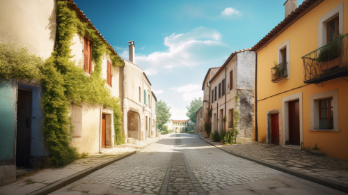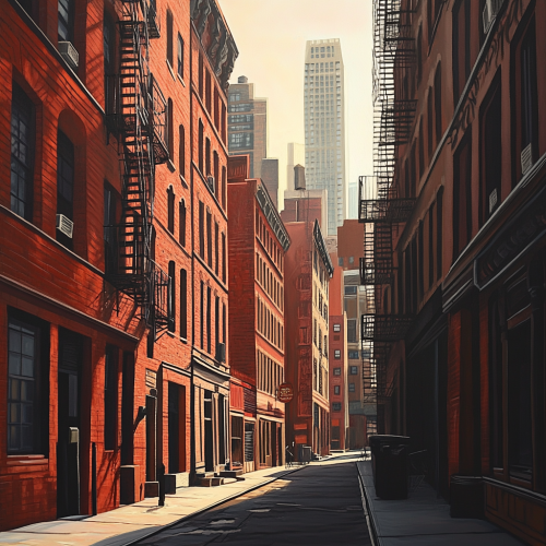 A quiet side street in Manhattan with classic red-brick buildings, soft morning light casting a warm hue, hints of city details like fire escapes and street signs, slightly blurred to create a sophisticated New York backdrop for mockups.