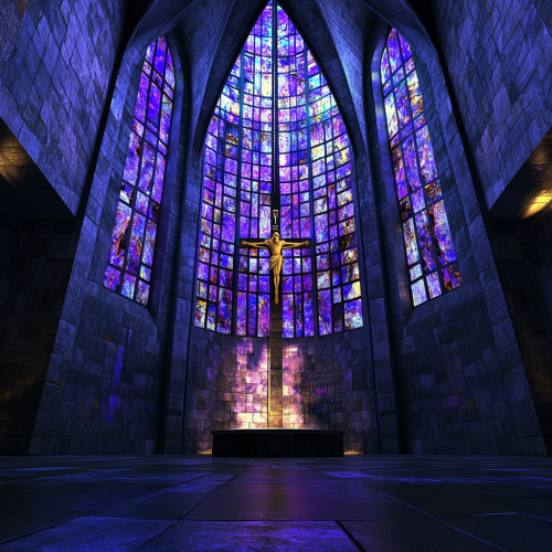 the cathedral interior designed as a high-end background image. use purple, black and blue theme colors. Stone wall like inside cathedral. No people. The room features a large stained glass wall. Part of the roof collapsed and the sky was visible. a large, The large Christ cross was broken and resting on the ceremonial altar lay in the middle of the room.