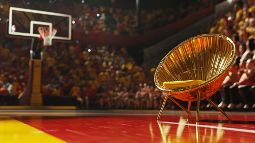 front full view, background of a basket ball match in red and yellow, fans cheering in the background, gold shell chair sits on the edge of the court, --ar 16:9 --s 50