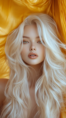 professional fashion photography of beautiful female model with big fake lips in a surreal golden silky canopy background. she has a beautiful abundant wavy long platinum blonde hair with extreme professional volume. she also has silicone implants --v 6.1 --ar 9:16 --style raw