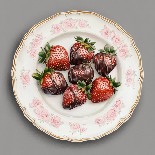 highly detailed watercolor clipart of multiple strawberries covered in chocolate, on a beautiful white porcelain dessert plate with delicate small ornaments in pastel pink, elegant and sophisticated, naturally composed composition, beautiful illustration with realistic details, high resolution, gray background