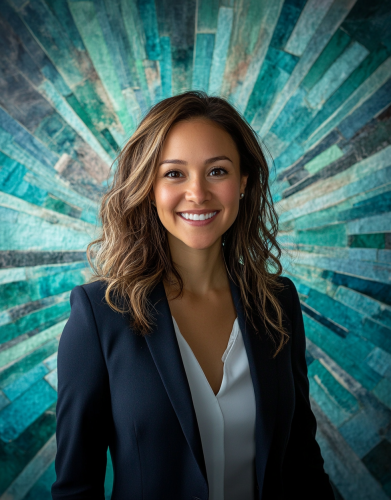 A high-quality photograph of a smartly brightly dressed corporate woman, smiling confidently in a relaxed pose. The background features dynamic, textured blocks that radiate outwards in a vibrant mix of turquoise, terrazzo, wood, and aluminium textures. These lines create a sense of motion and excitement, adding depth and visual interest. The scene has a modern, energetic vibe with a pop of color and a sophisticated feel, making the woman stand out against the textured, radial backdrop. --ar 7:9